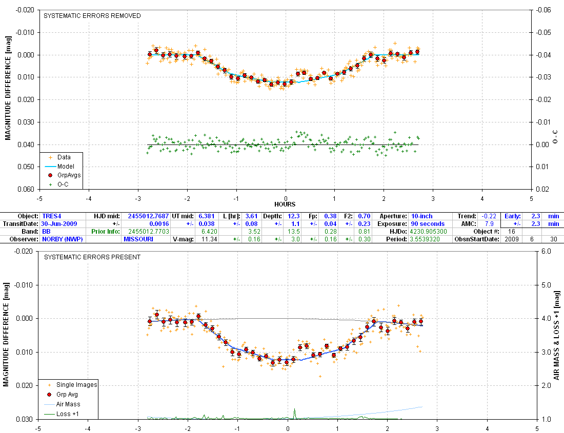 LCs showing depth = 10.8 mmag (z' and B-bands) with a length of ~3.5