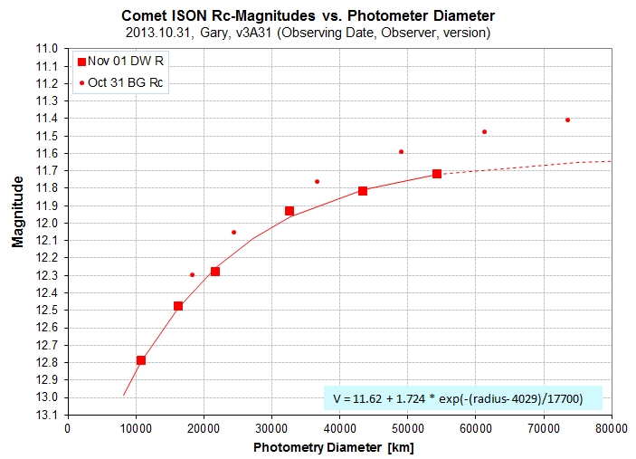 This website is a record of observations of Comet C/2012 S1 (ISON) by amateurs Bruce Gary, Dennis Whitmer and Tom Kaye, using 11-inch, 14-inch and 32-inch telescopes, respectively. We live a few miles from each other in Hereford Arizona. When I was the first to obtain a "recovery image" of the comet on August 12, after it had been unobservable during June/July, and when I noted that it was fainter than expected, an unexpected amount of publicity for this web page occurred. I therefore felt obligated to maintain this web site with observations and analyses worthy of that attention. My long-term goal used to be a monitoring of the coma by measuring brightness versus diameter at 3 wavelengths (g'r'i') with a goal of detecting brightness outbursts caused by temperature-dependent volatile activity. Measurements on several dates in August (after reappearing from behind the sun) showed that the comet's inner coma was brightening at a lower rate than expected, as if the activity level on the nucleus surface was not changing (or at times even decreasing), in spite of it continuing to approach the sun. A few of investigators suggested that there may be a late "coming alive" for this particular comet, whereas another suggests that it may fade abruptly in early November. This web page was meant for other amateur astronomers and sane lay people readers. Conspiracy-minded readers: Please do not e-mail me to ask if Comet ISON poses a danger to Earth; it doesn't. Professional astronomer readers: Any use of data on this web page is at your own risk; keep in mind that the measurements and analyses were performed by amateurs.
