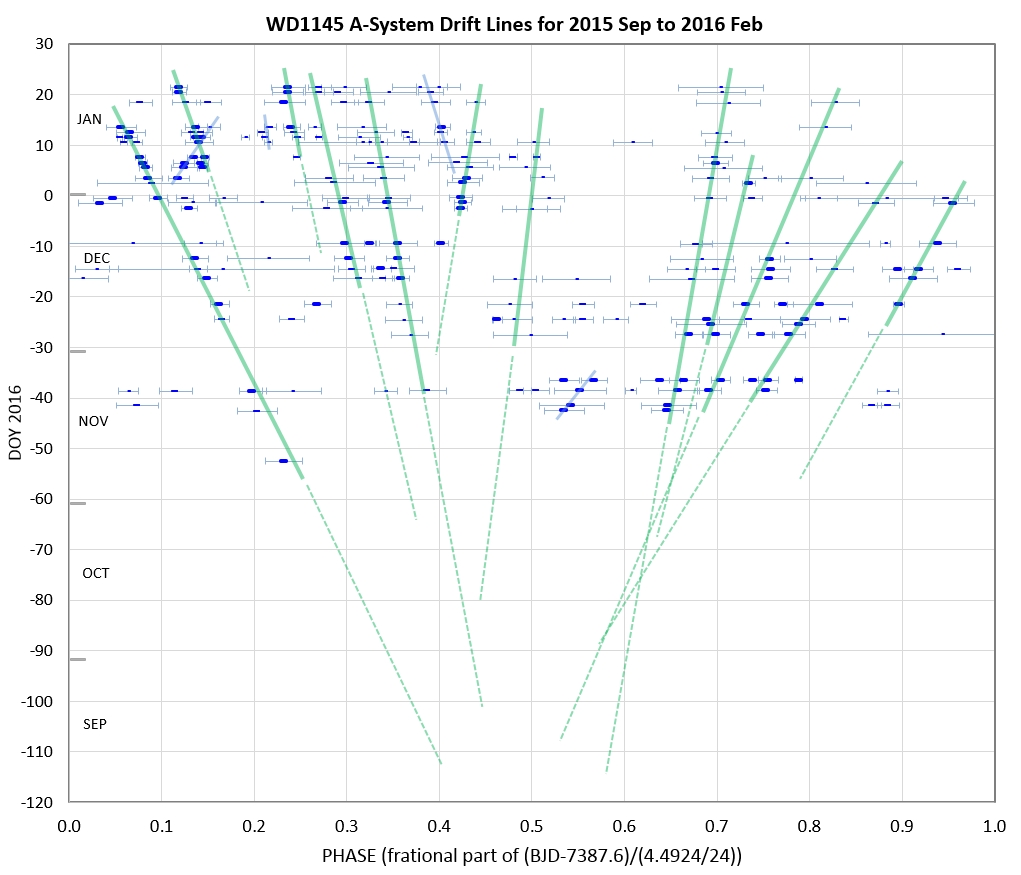 Consider the light curve for a WD with a low "packing fraction" (J0139). Every 107 days, approximately, there are dozens of dips, with each dip presumably the result of a collision. The series of dips (the individual ones aren't shown in this graph) last about a week. Notice that the 107-day timing is inexact (e.g., #2 is late). This is because some collision cascades take longer to reach a peak than other cascades. Also, notice that sometimes no cascade occurs (e.g., #6). The greatest deviation from a repeating 107-day occurrence is #9. (It's possible that the early set of dips was produced by a second interloper.)